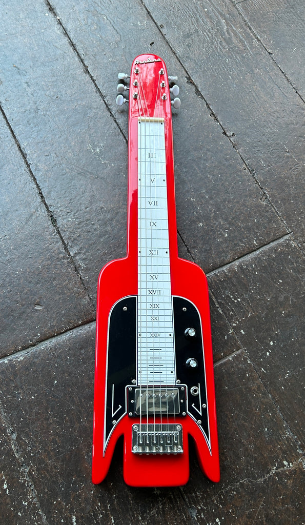 The Airline Lap Steel is a tribute model to vintage National brand Lap Steel guitars produced by Valco in the late 1950’s and early 1960’s. It features a solid Basswood body, Humbucking pickup, adjustable bridge, and a unique Roman numeral motif on the acrylic fingerboard. With impressive tone, sustain, and a quirky design, this lap steel is sure to stand out in any performance.