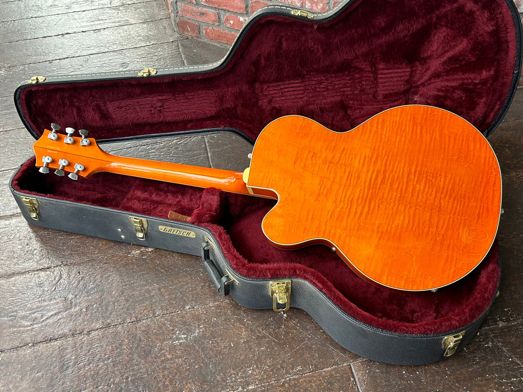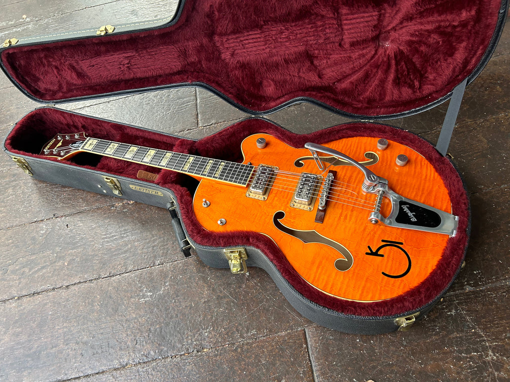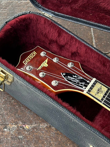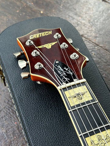 Other Features ?? ??Nitrocellulose Lacquer Finish, Aged Vintage Western Block Inlay Position Markers of Cactus, Steerheads and Fences, Routed "G" Brand on the Body, Aged Fingerboard and Headstock Binding, Multiple Aged Body Bindings, Stained Curly Maple Headstock Overlay, Inlaid Pearloid Steerhead and Gretsch Logo on Headstock, Bound Oversized F-Holes, Clear Plexi Pickguard with Embossed "Gretsch", Polished Aluminum Bigsby??, G-Arrow Control Knobs, Knurled Strap Retainer Knobs, Adjustable Truss Rod