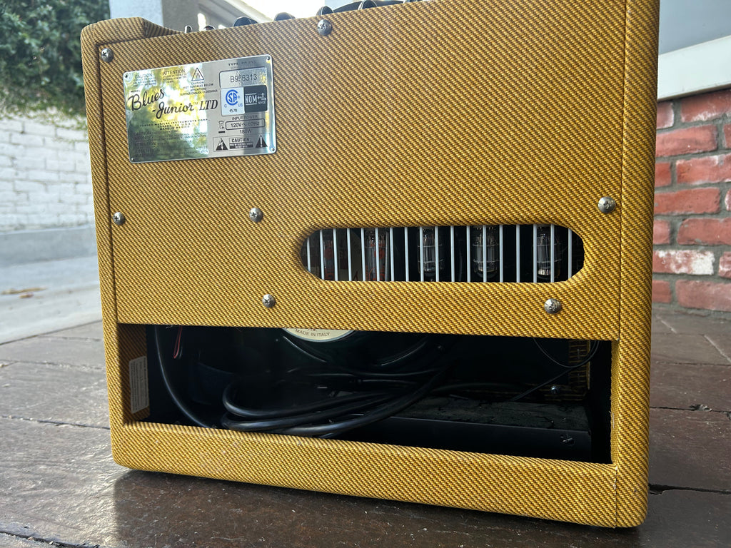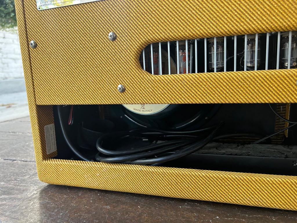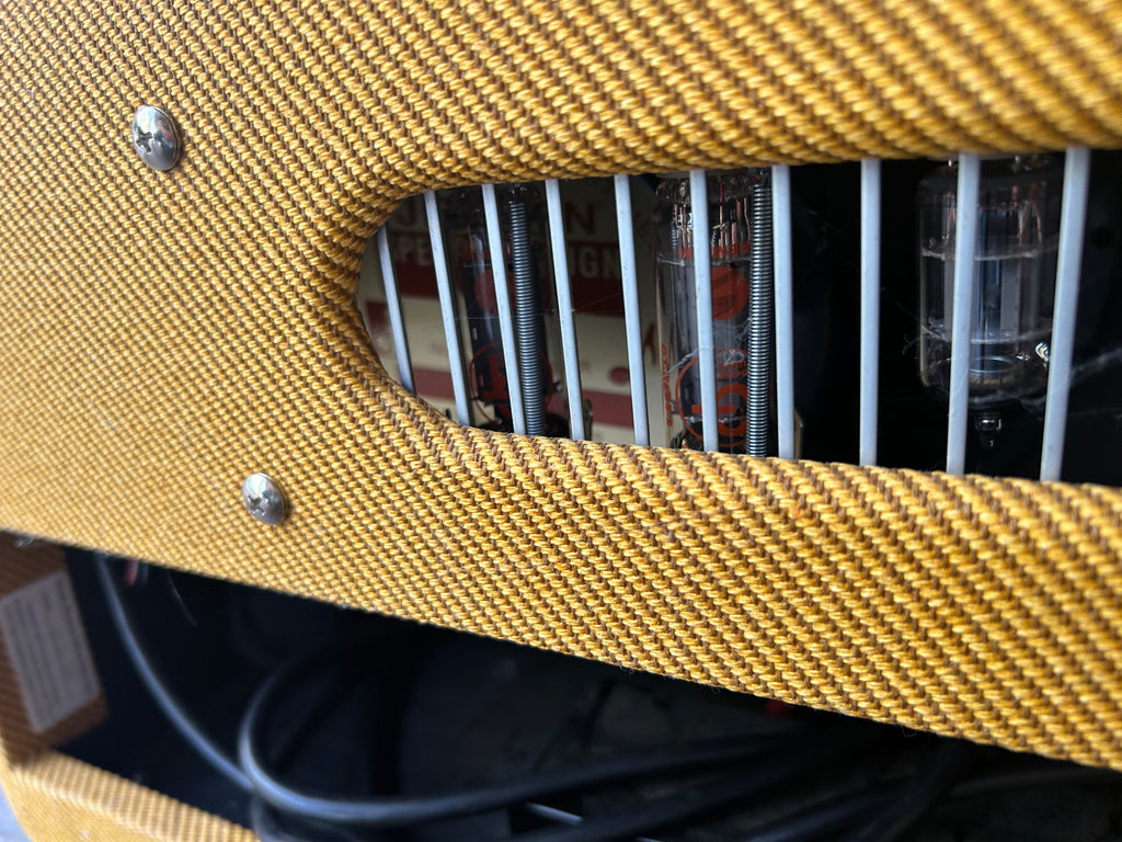 Takes Fender's 15W gem and gives it the true vintage treatment with a lacquered tweed covering and a vintage-voiced 12" Jensen speaker. Its golden tones are generated by an all-tube signal path using a pair of EL84 output tubes and 3 - 12AX7 preamp tubes. Add renowned Fender reverb, flexible controls, FAT switch for mid boost, and you're in business. And just look at that chrome panel, that tweed finish with vintage-style brown and gold grille cloth, and those vintage pointer knobs!Amplifier Covering