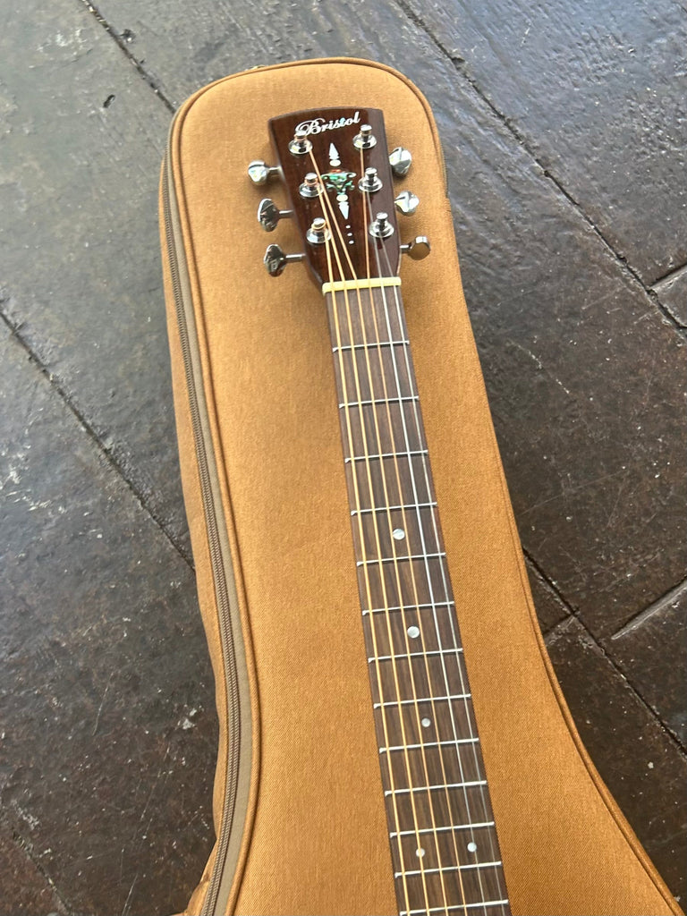 The Bristol BD-216E boasts a solid, purposely aged spruce top, solid mahogany back and sides, and a comfortable mahogany neck with a rosewood fingerboard, ensuring exceptional clarity, volume, and balance. And with the built-in pickup system, the BD-216E is stage-ready!