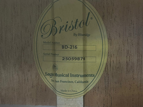 Bristol by Blueridge Guitars has made history again with the BD-216E, the newest addition to their popular line of acoustic instruments. The BD-216E isn't just another dreadnaught; its a masterpiece combining vintage design and premium materials for the look, feel, and sound of a well-played classic, plus the L.R. Baggs E.A.S. pickup system.