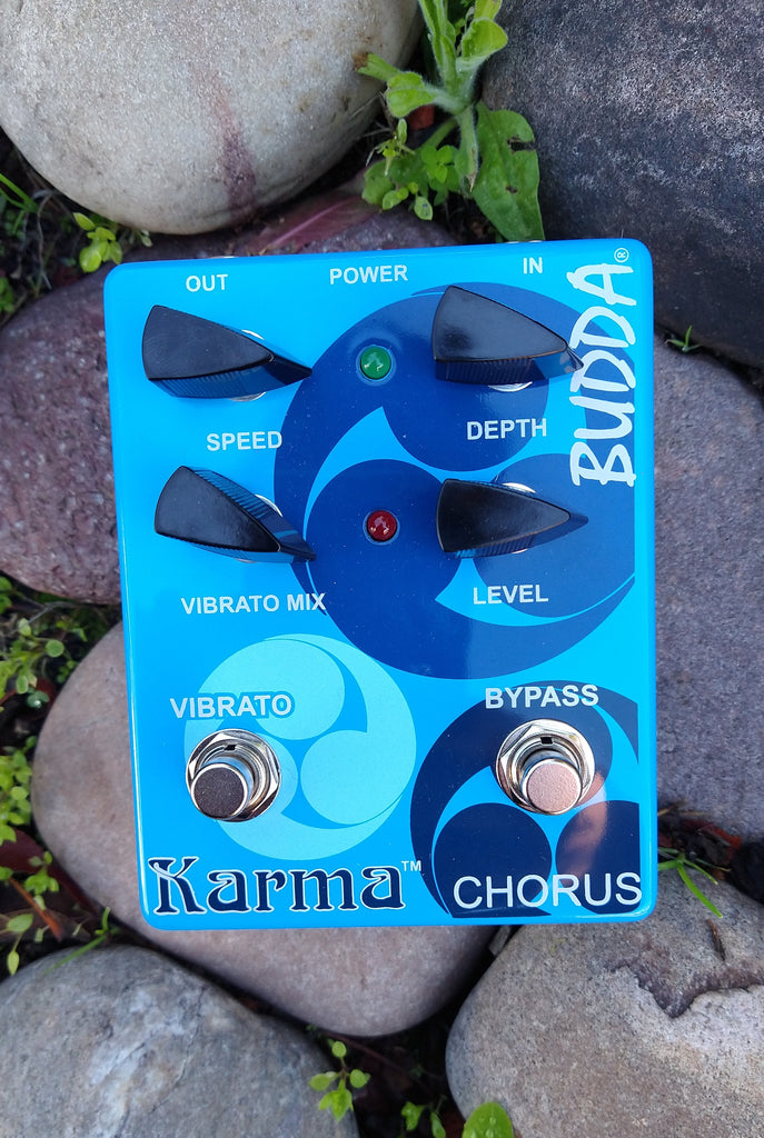The Budda® Karma™ Chorus is a very unique chorus pedal that also includes a vibrato effect. Engaging the Vibrato switch and turning the vibrato mix knob allows the user to dial from chorus (counter clockwise) to vibrato (clockwise) and any blend in between. The Karma™ Chorus is in a heavy duty die cast metal case and is ready for your pedalboard!