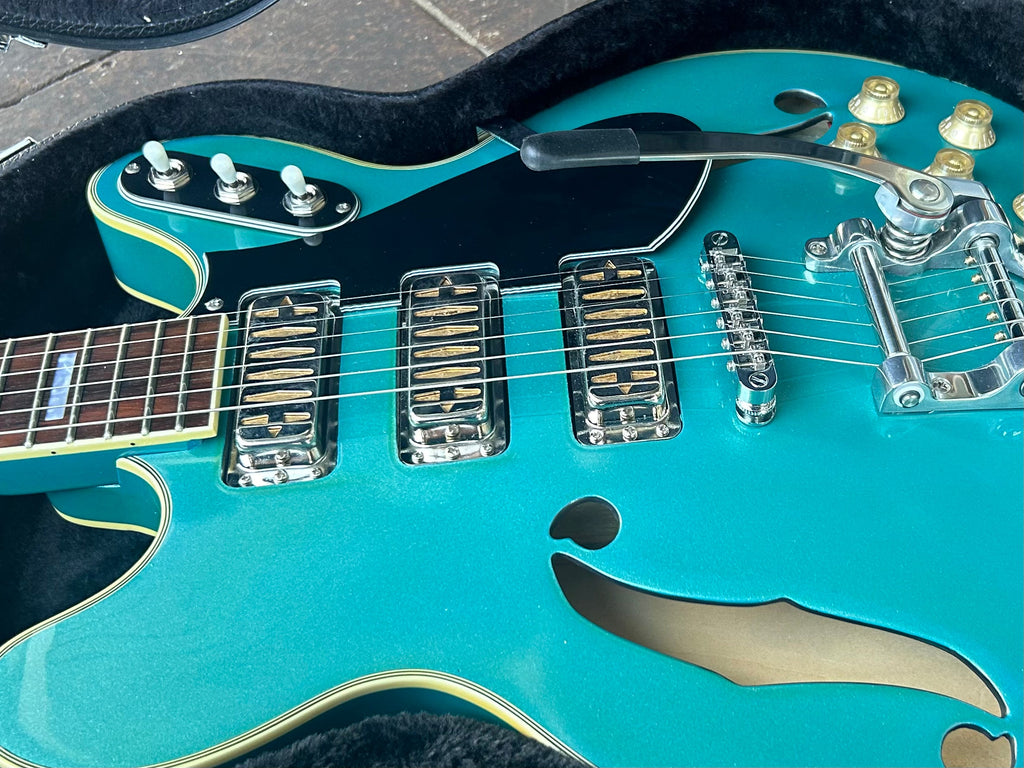 The Airline H78 is our tribute to the early-60s Harmony model of the same name. In the 60s, the H78 was also sold under the Silvertone and Airline brand names through Sears and Montgomery Ward. The top of the Harmony line at the time, the H78 provided a Bigsby tailpiece and unique independent toggle switching for each of the three DeArmond gold foil pickups.