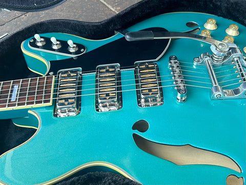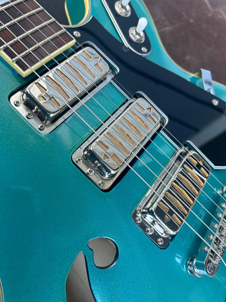 We????ve not only recreated but upgraded this beautiful mid-century design for the modern stage musician, adding a fully adjustable roller bridge, truss rod, and center block for maximum adjustability and feedback suppression. Our Valco Argyle gold foil pickups recreate the DeArmonds???? thick, rich tones that sound great at both crystal clear rolled-back volumes and when heavily driven.