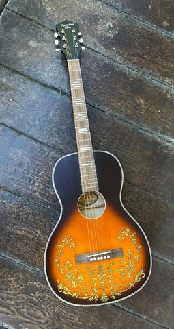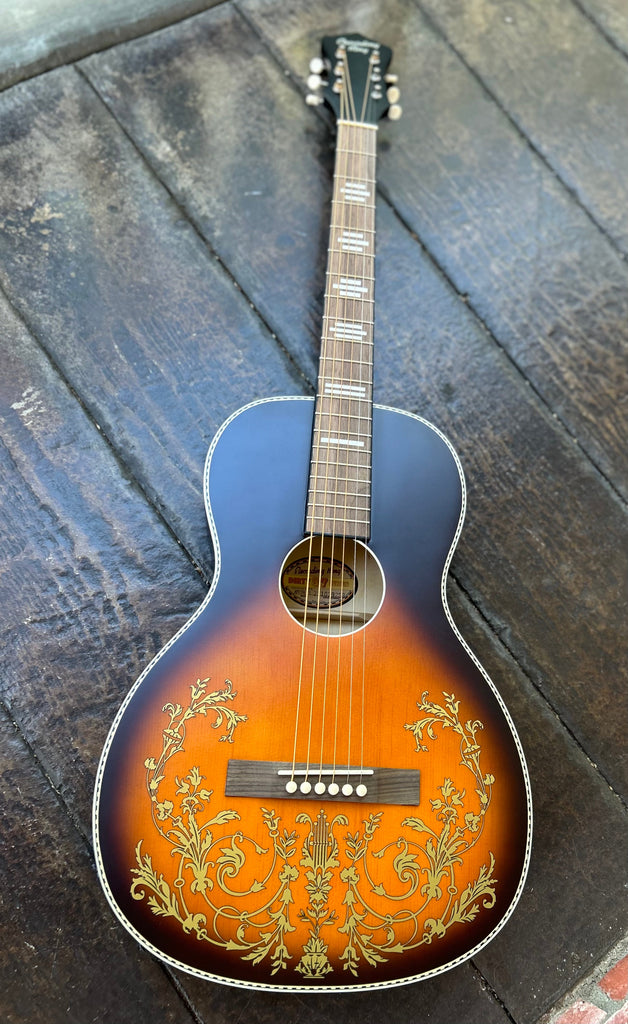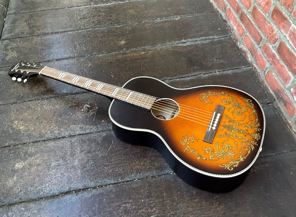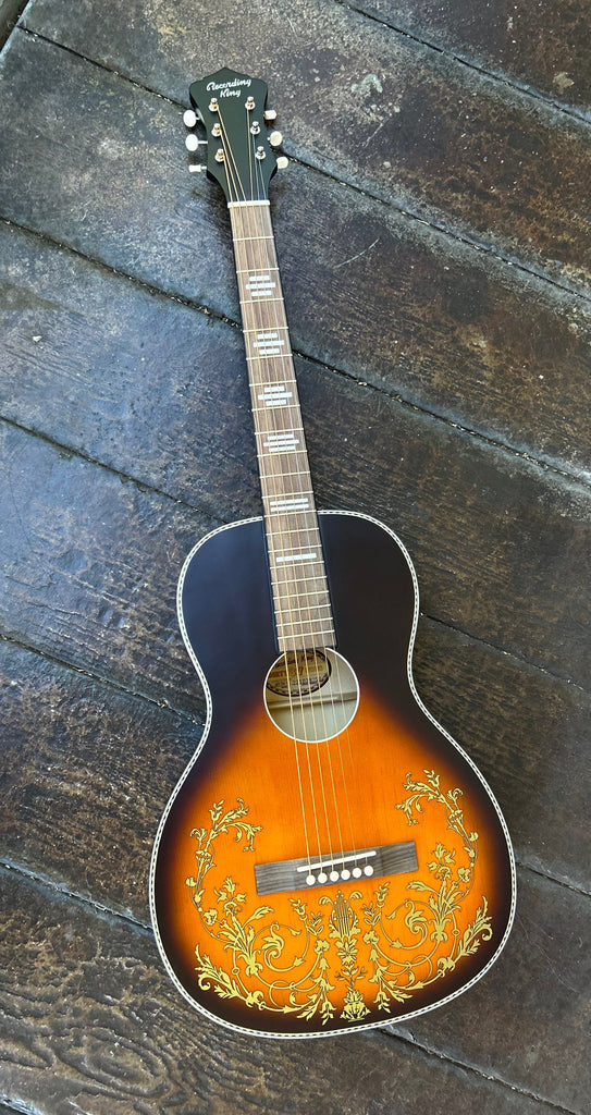 The Recording King Dirty 30's Series 7 Limited Edition Golden Strings model (RPS-7G-TS) is an homage to the styling of early 20th century parlor guitars. Intricate fancywork beautifully complements this guitar????s tobacco sunburst finish, adding another layer of vintage cool to this old school stunner.??
