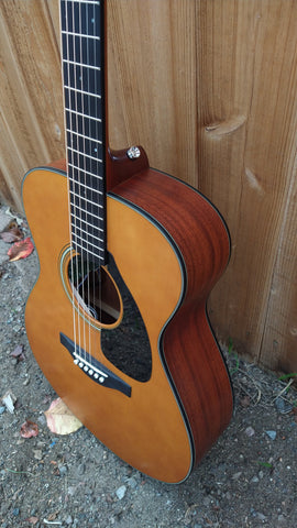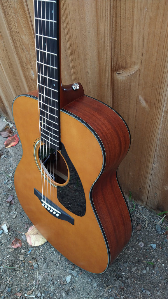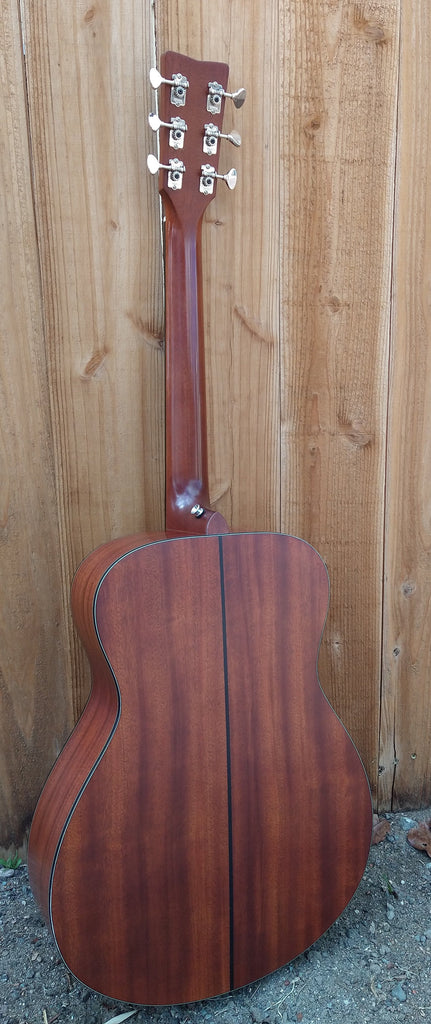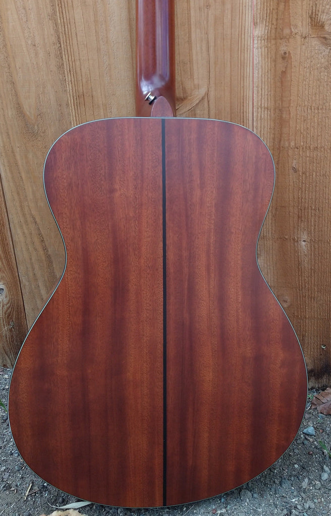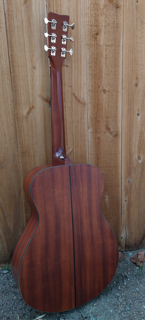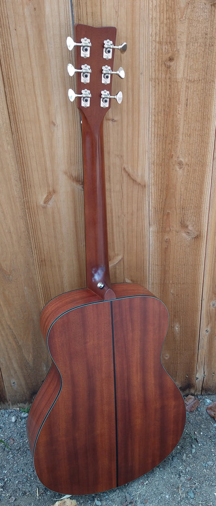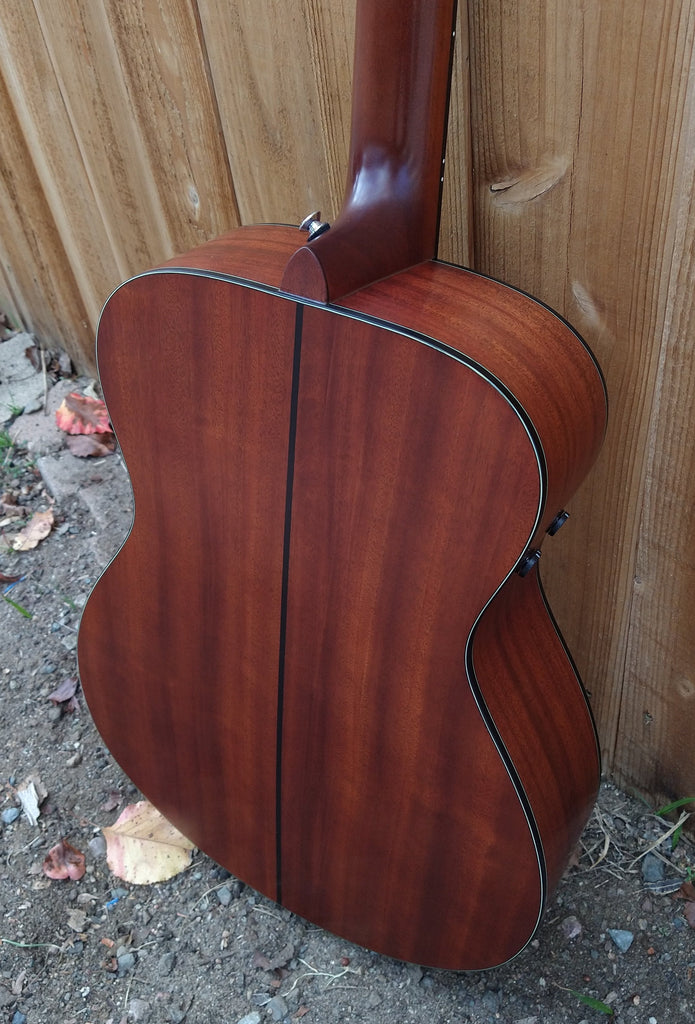 Solid Sitka spruce top and solid mahogany back and sides provide rich tone and projection