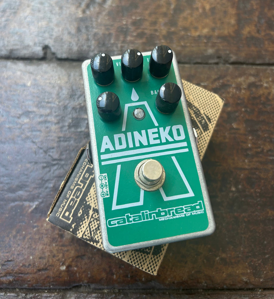 Oil can delay units were manufactured by a company named Tel-Ray who later became better known as Morley. Tel-Ray mostly focused on being the OEM utilizing their oil can technology (Patent US3530227 A), branding units for Gibson (GA-RE4), Fender (Dimension IV), Acoustic, etc. They employed an electro-static storage method where the signal is ????recorded???? to a spinning disk, a layer of oil (for years rumored to be a mysterious carcinogenic oil) prevented this signal from leaking into the air before a ????pickup???? moments later played back the signal recorded to the disk. Compared to the counterparts of the day (tape, drum, wire delay machines), their sound was more low fidelity, murky, often with a more consistent musical vibrato that correlated to the spinning disk speed. We like to describe the sound as mysterious. The Catalinbread ADINEKO pedal is an echo, reverb, vibrato pedal that faithfully models the sonic experience of these oil can units.