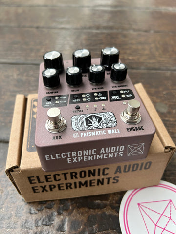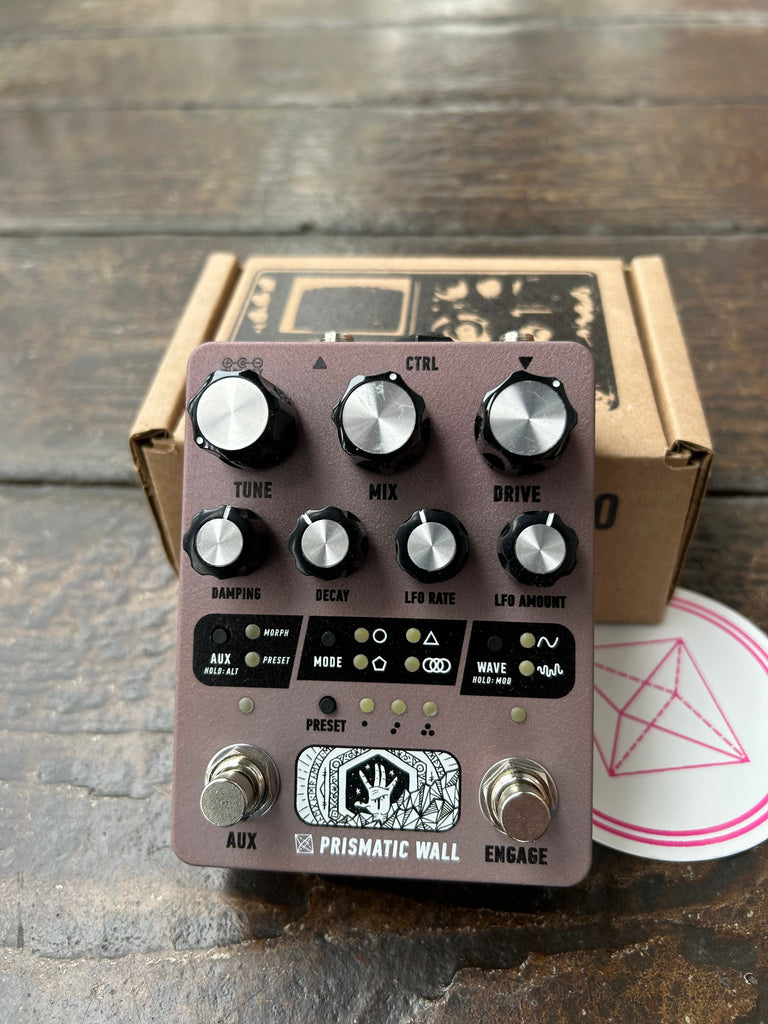Prismatic Wall is a sympathetic resonator designed to transmute incoming sounds into the vibrations of an illusory bank of tuned strings. Part reverb and part synthesizer, its metallic yet warm timbres span from the subtle harmonic aura of a third bridge to the rich chromatic suspensions of a grand piano. The simulated vibrations form a sustaining spectral extension of your instrument that retains a tangible physicality despite its surrealist underpinnings. The resonances are reactive in nature: playing in tune excites specific pitches, while percussive attacks excite all the strings in tandem.