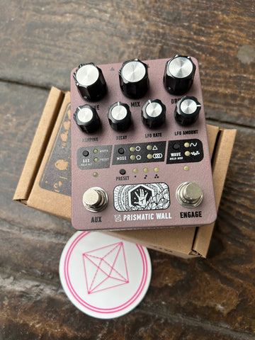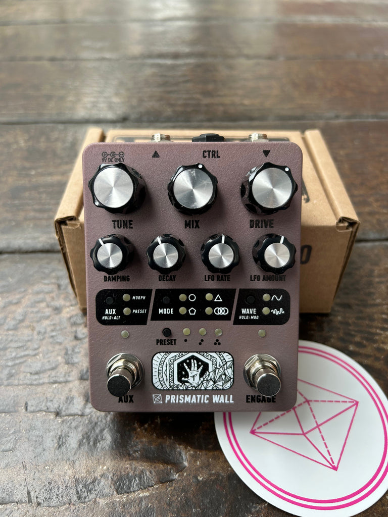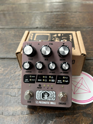 Prismatic Wall utilizes a physical string model formed by tuned delay lines. Tuning is achieved by varying the sample rate of the system, manipulating the physical model in decidedly non-physical ways. The Mode selector determines the interval spacing between strings, with each configuration carefully selected to maintain a sense of harmonic ambiguity. Damping and Decay change the brightness and sustain of the strings, ranging from short plucks to infinite drones.