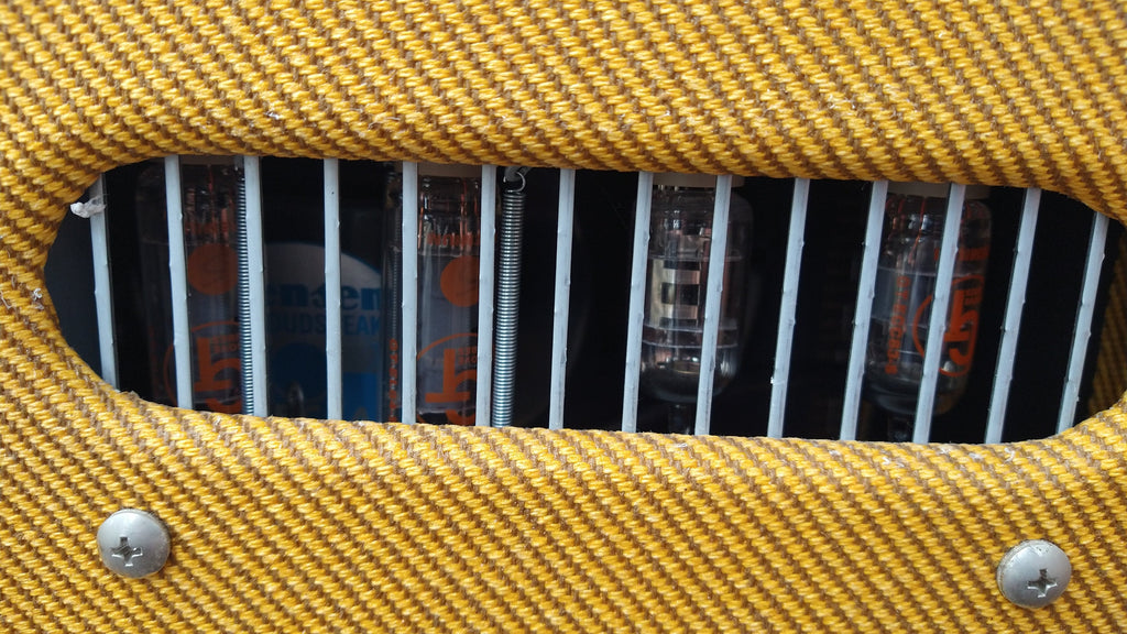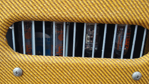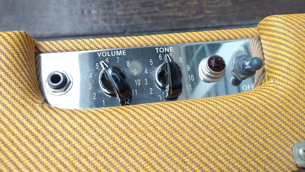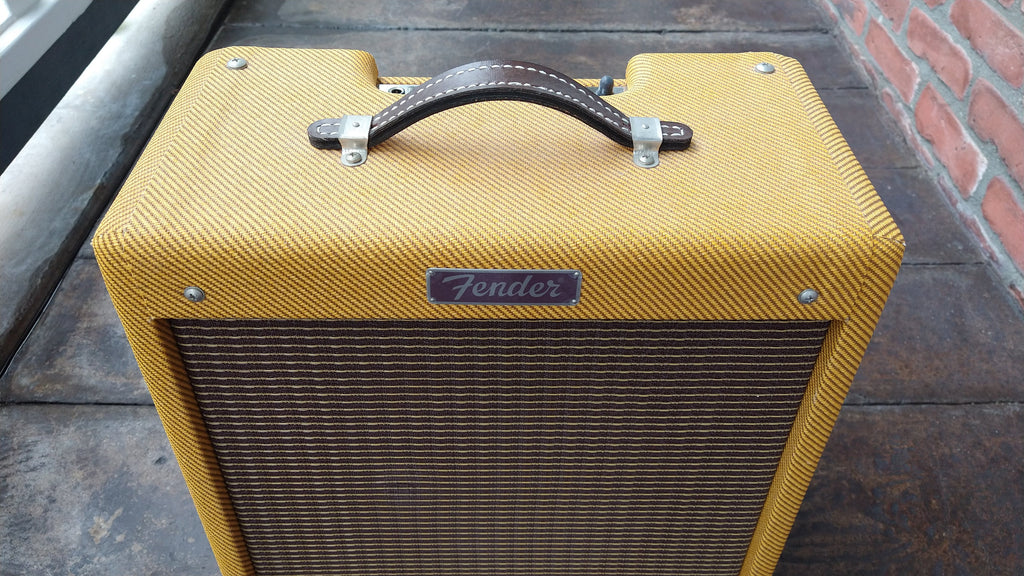 - Lacquered tweed covering; vintage-style '50s grille cloth; leather handle