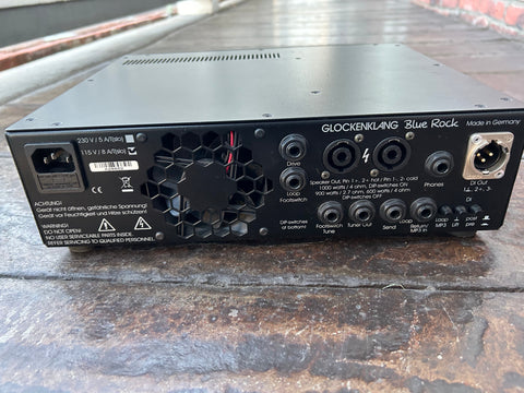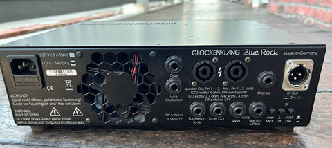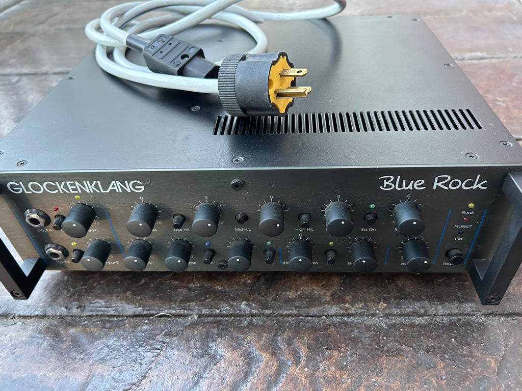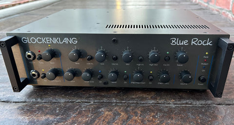 The Blue Rock is our next Class D amp. Like all other Glockenklang amps, it features a warm and dynamic sound up to full power. Two switchable inputs, footswitchable Drive stage with Level pot and adjustable Voice filter, on-switchable 5-band eq with 3 frequency switchable Mids, switchable effects-loop, mp3-player input, symmetrical, adjustable DI-out, tuner out and phones output are the main features. High-end mains cable and 19" rack-ears are included.