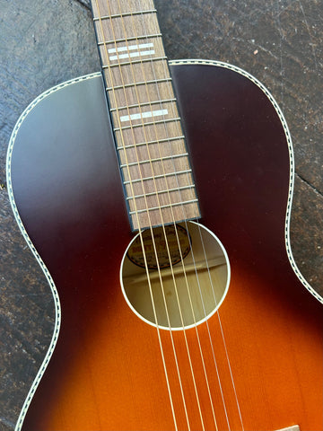 The spruce top provides the foundation for classic acoustic tone beneath the Tobacco Sunburst finish. The bound soundhole and Harmonella stencil fretboard markers are both functional and stylistic.